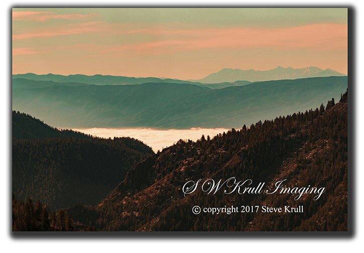 Today my diligence was rewarded with the amazing spectacle of a giant lake of fog between Grouse Mountain and the Sangre De Cristo. I hoped it would remain until we could get to the high spot for the best view of the rugged canyon and the high peaks of the Sangres. Fortunately it did and we got the shots 🙂
