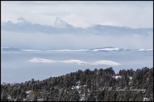 Then from the summit the view was stunning. The mountains in the background were just beautiful as they jutted above the fog in the valley below, and there were a couple of the smaller peaks that were just peeking through the fog in the lower valley. And as with the aspen trees, the dense pine wilderness of the Pike National Forest was also sporting a new mantle of white from the fog and snow.