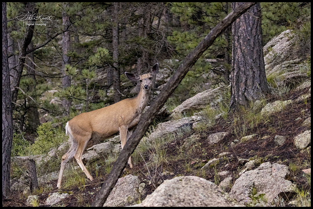 I haven’t been to the river in a while so I wasn’t sure what I might find early on this beautiful summer morning in Eleven Mile Canyon. As I neared the bird habitat I was fortunate to spot a couple of mule deer does making their way up the canyon walls after an early morning drink. I quickly set my camera to shutter priority mode with a 1000th of a second dialed in. Deer pictures usually work well with a +1/3 exposure compensation so that’s what I used. When I stopped the truck and aimed my lens out the window, the deer increased their pace but stopped to look back for a couple of nice portraits 🙂
