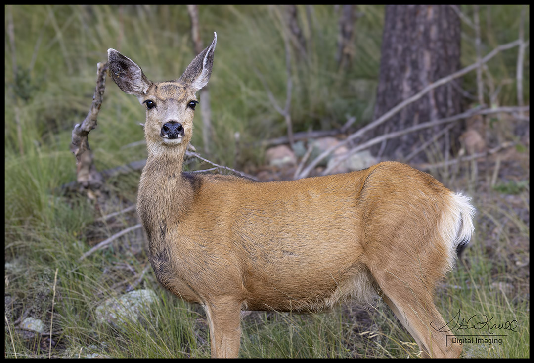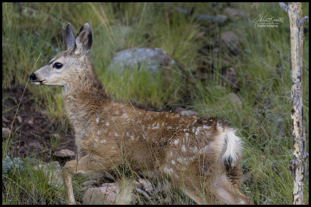 Alas, there were no elk on the summit but there were a few cute mule deer, including a doe with her curious fawn in tow. They stopped briefly to check me out and kept on walking. With my long lens I was able to photograph from a distance beyond their danger zone.