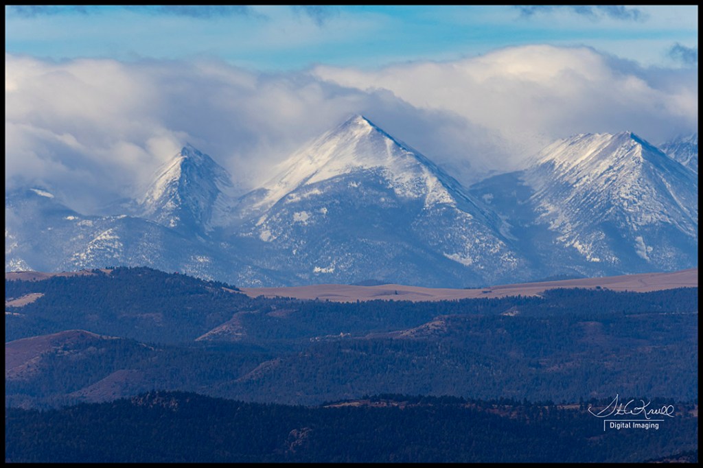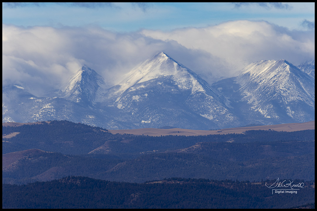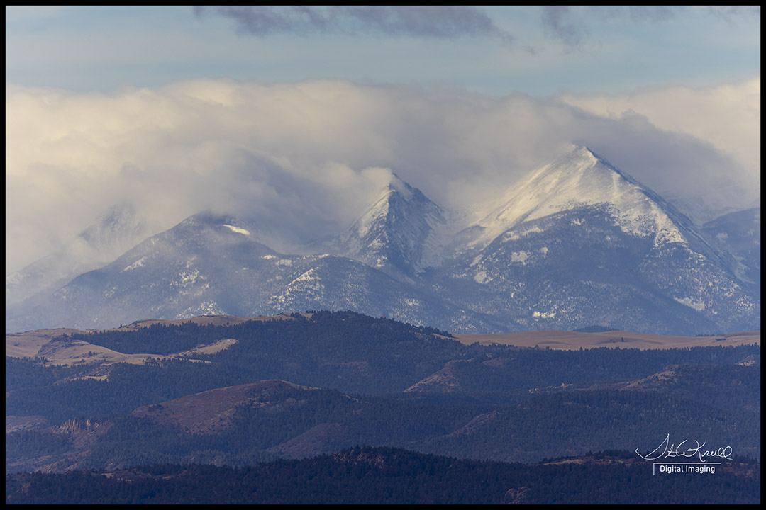 One look out the window and down the valley and it’s obvious that more snow is on the way! The first place it shows up is over the Sangre de Cristo Range where storm clouds spilling over the mountains is simply stunningly beautiful! Sometimes that’s as far as the clouds go though, the clouds stall out over the mountains and all we see is sunshine on the other side of the Arkansas River Valley. Not today though, a few steps down my trail and and I was acutely aware of what’s to come… Cloudy, cold and wind blowing about a hundred miles an hour 😦 So I just hiked to the overlook to capture a few images of the amazing scene and just scrambled back to the truck to escape the gale!