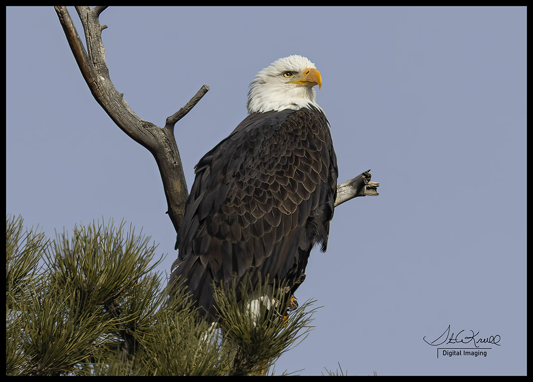 I would have to say it was a great day in Eleven Mile Canyon… At least four eagles sighted! Kevin and I are pretty sure we saw Speckles in the south end of the canyon but he was too wily for us, evading all attempts at a detailed image. Every time he spotted the truck he just took flight upstream until he finally apparently went home to escape our prying lenses. Our favorite nesting pair were sitting in a tree together well behind their nest and way out of range for a nice picture, but I did snap this one just for the record!