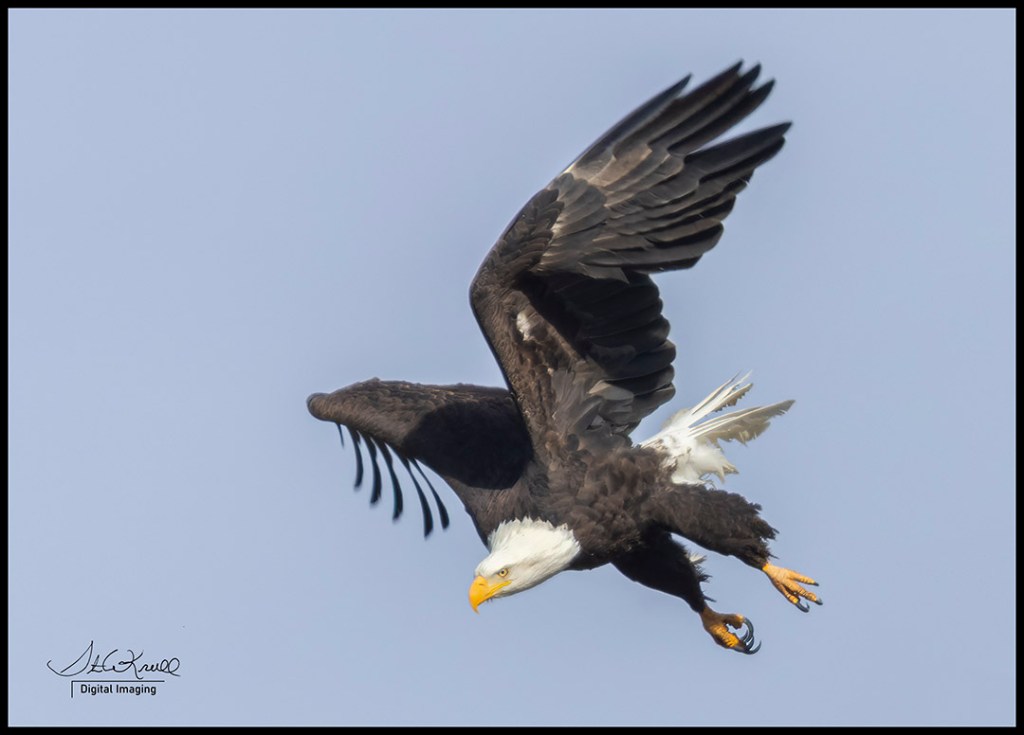 I also got a few captures of him flying overhead but apparently the winter sun wasn’t able to get much light on him at the angle we were shooting, but I did manage to get one capture with a little light on his head and wingtips (below).