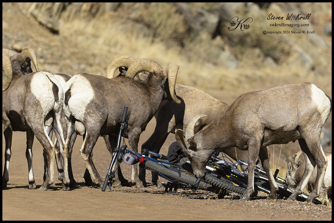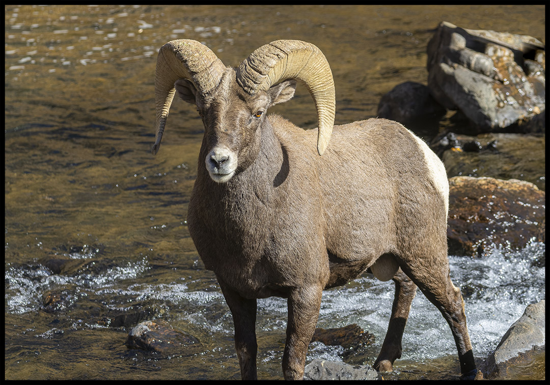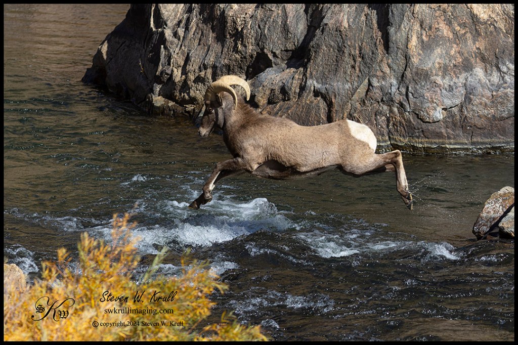 Each year as Thanksgiving draws near, the bighorn rams of Waterton Canyon grow restless. Early winter is the rut season in bighorn country, and the big rams come down to the South Platte River to compete for rights to the ewes, which are preparing for the breeding season in their own way. Our mountain bike ride up the canyon was a successful one, as we caught quite a bit of action in the placid waters of the river just above the lower dam.