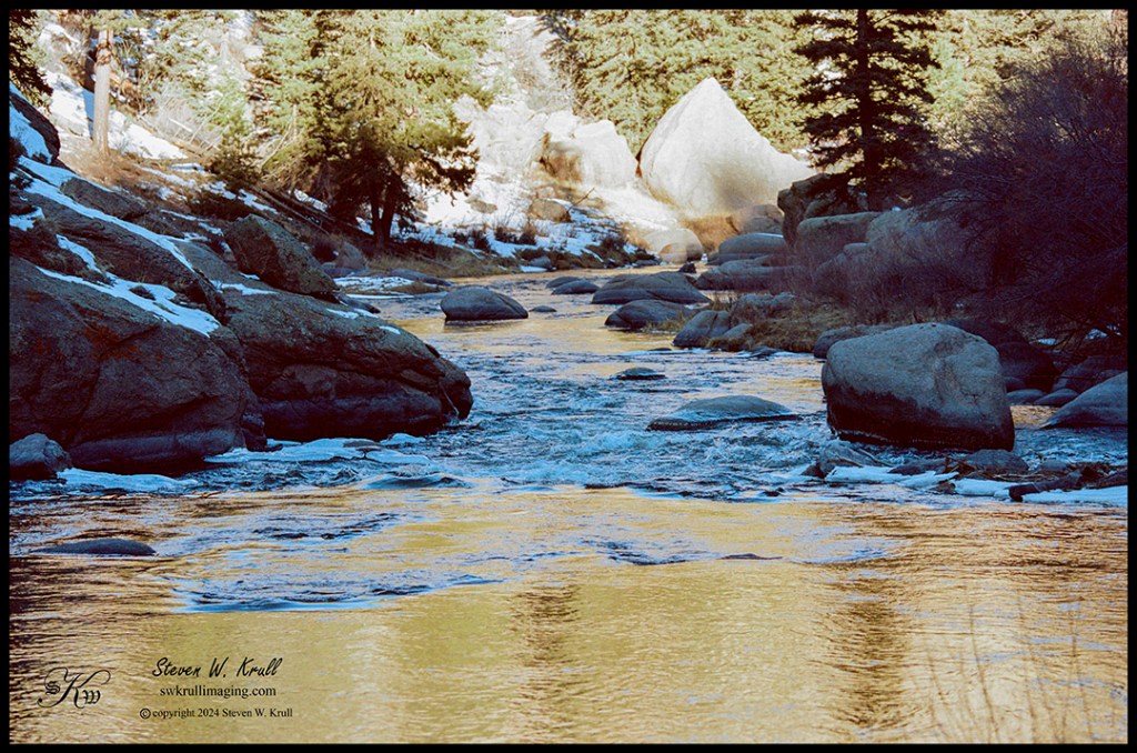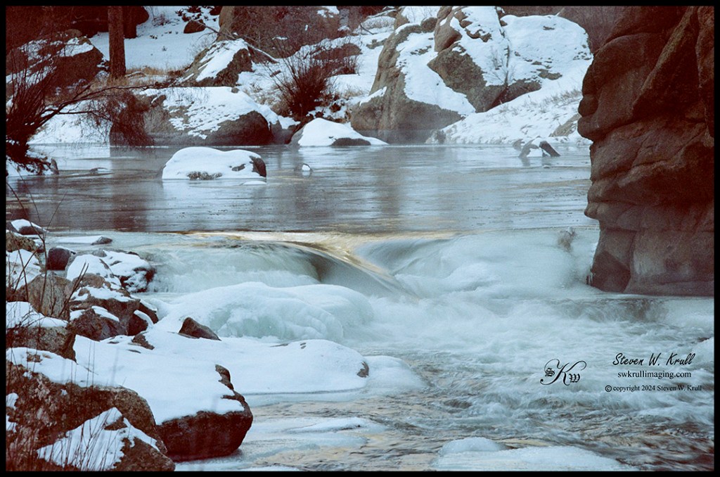 I worked hard to capture some motion blur of the South Platte River drifting through the frozen canyon. You can see a faint hint of the golden light of sunrise in the water just before it spills over the boulders.