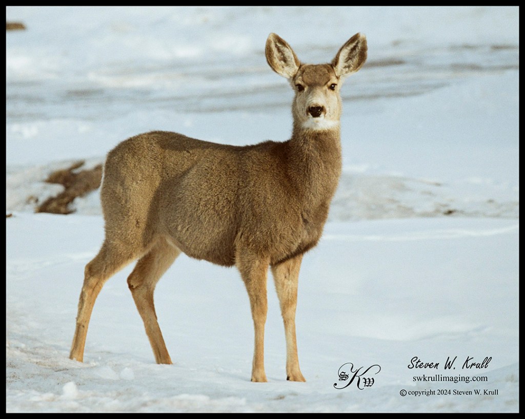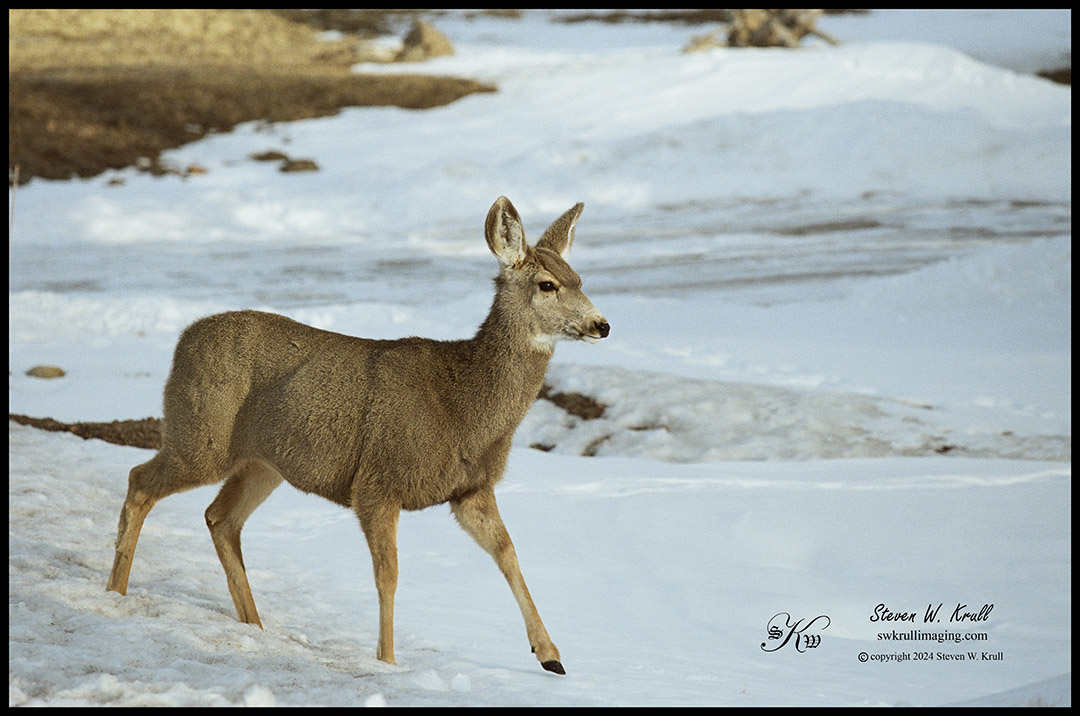 I had a roll of Kodak Portra 160 film loaded in my Canon EOS 7 film camera with the intention of shooting some street photography and sporting events including closeup images of people, which never seemed to materialize. But I thought the film did a beautiful job on this doe mule deer standing in the snow.