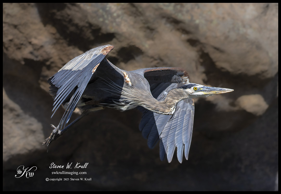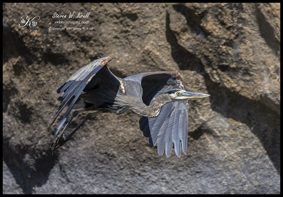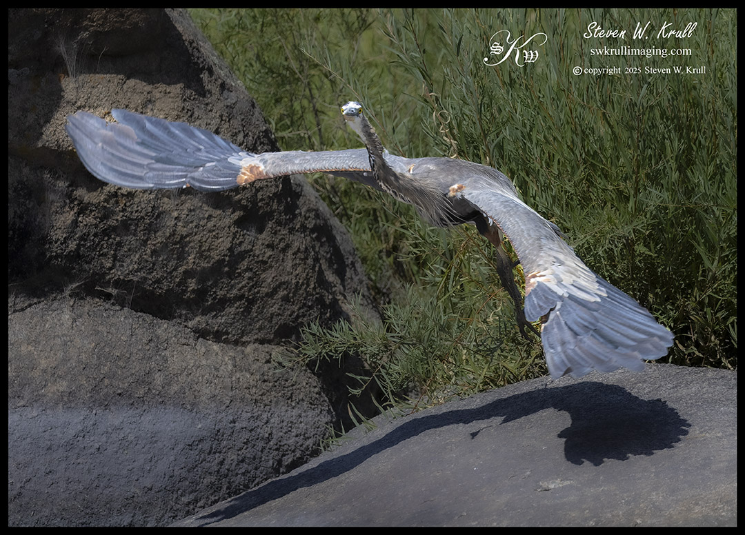 I crept down to the riverbank and found a good spot to sit where I cold brace my big lens with my knee as I watched the action unfold. The great bird walked around on the rock, and I hoped he would spot a fish and hop in after it. A few times the giant bird made promising movements, but never did jump into the placid pool beneath him.