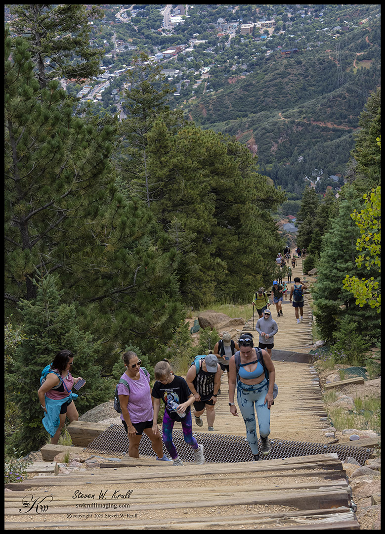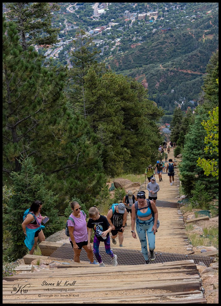 The views from the steep trail are incredible. Below you can see the city of Manitou Springs, Colorado Springs, and even Garden of the Gods from some vantage points, as others struggle to climb stairs that occasionally require a near crawl on hands and knees.