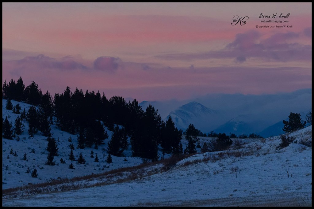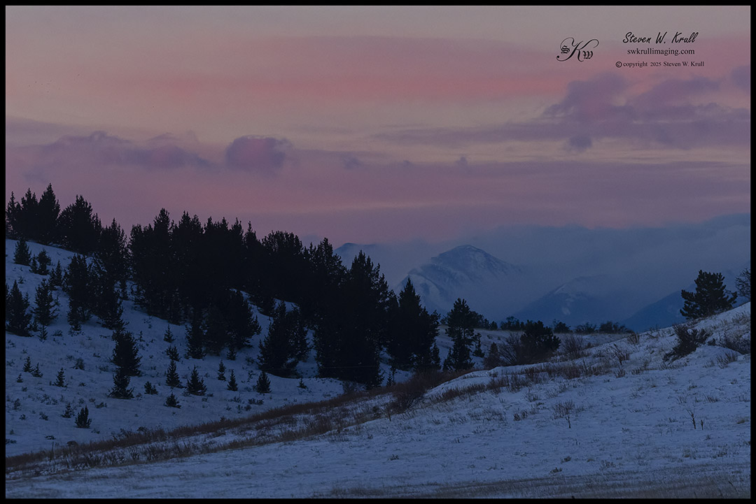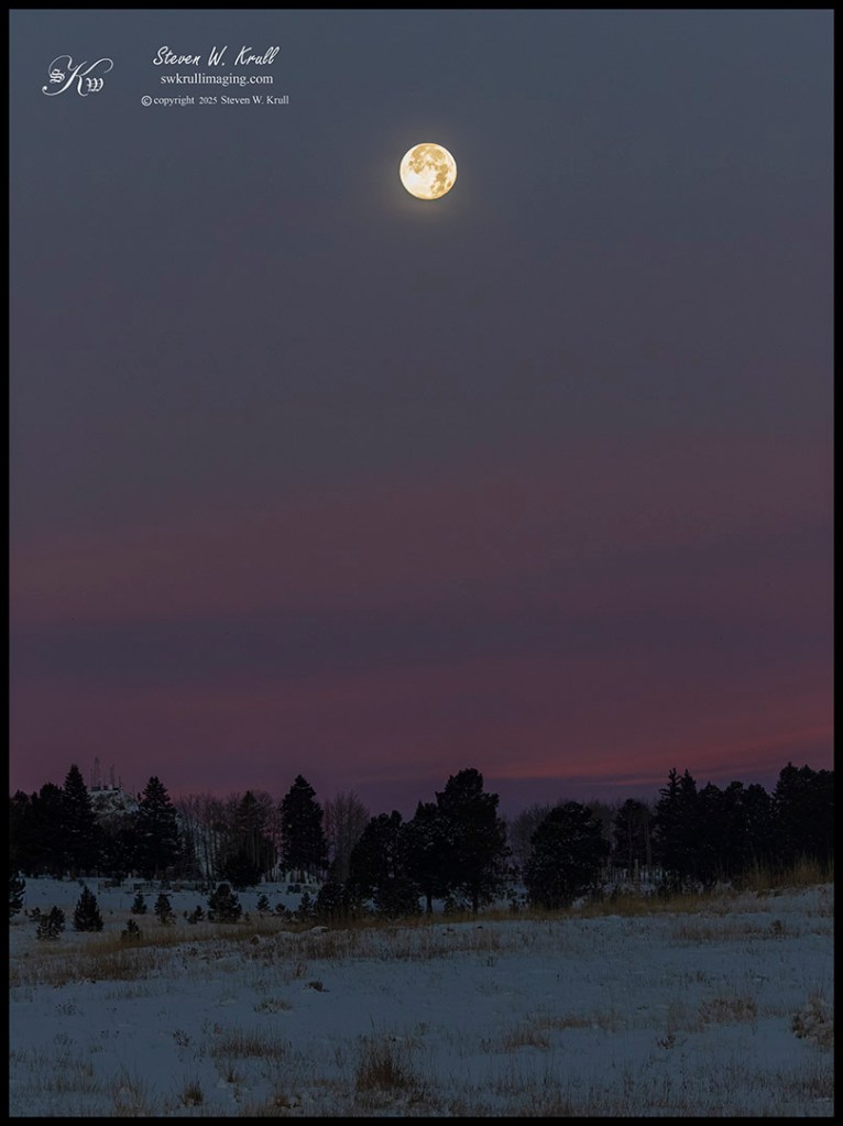 My morning began in the dark of night, long before first rays of sunshine began to clear the ridge to the east. I wasn’t exactly sure where the best view of the moonset would be, so I had some driving around to do before I could be ready. Eventually I picked a spot very close to my home, next to some open space with a good view of new snow and the setting moon.