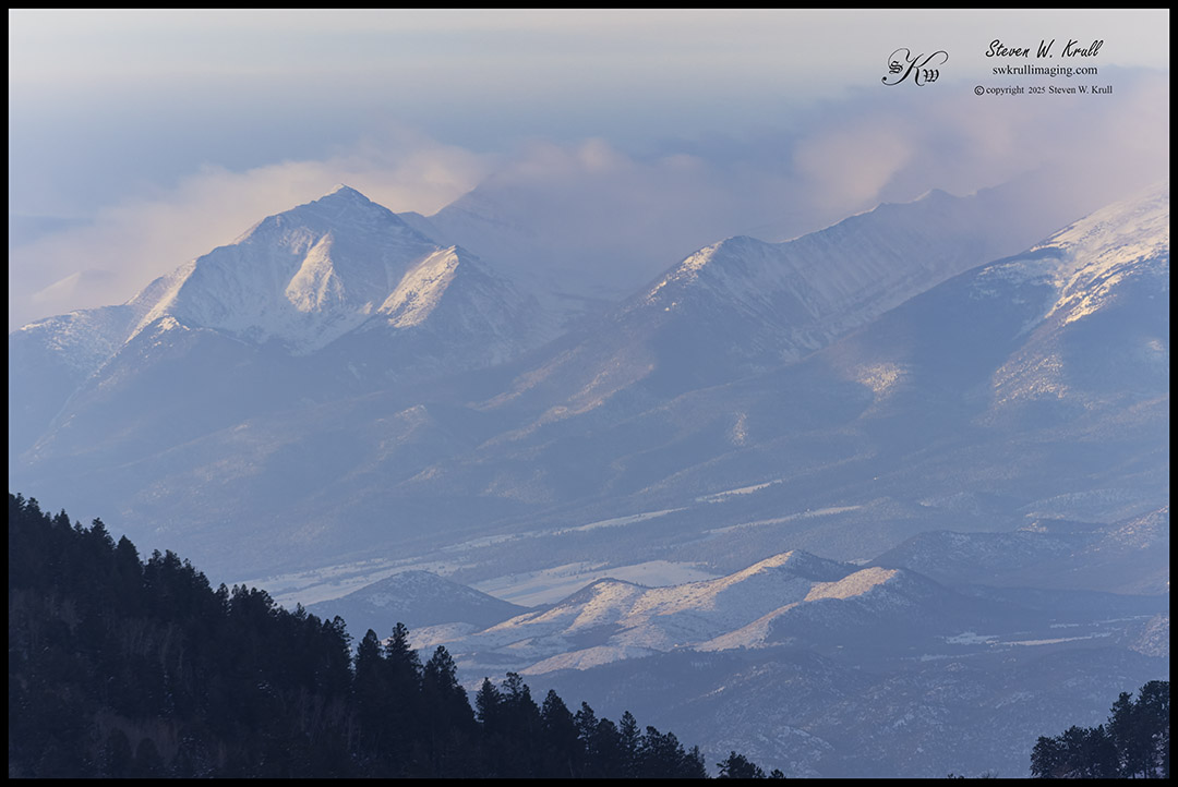 By this time the sun was fully illuminating the new mantle of snow on the Sangre de Cristo Range, which were enhanced even further by remnants of the storm clouds, still lingering on the high peaks.