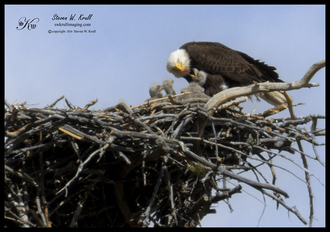 When I returned to the nest I was excited to discover two little heads, so I quickly grabbed my binoculars for a look. As I gazed carefully at the activity, it soon became apparent that there were three new eaglets this season, for mom and dad to feed! This particular breeding pair has proven to be quite good at caring for their little ones, and last year they raised three healthy young ones to flight. Hopefully that will be the case this year as well!