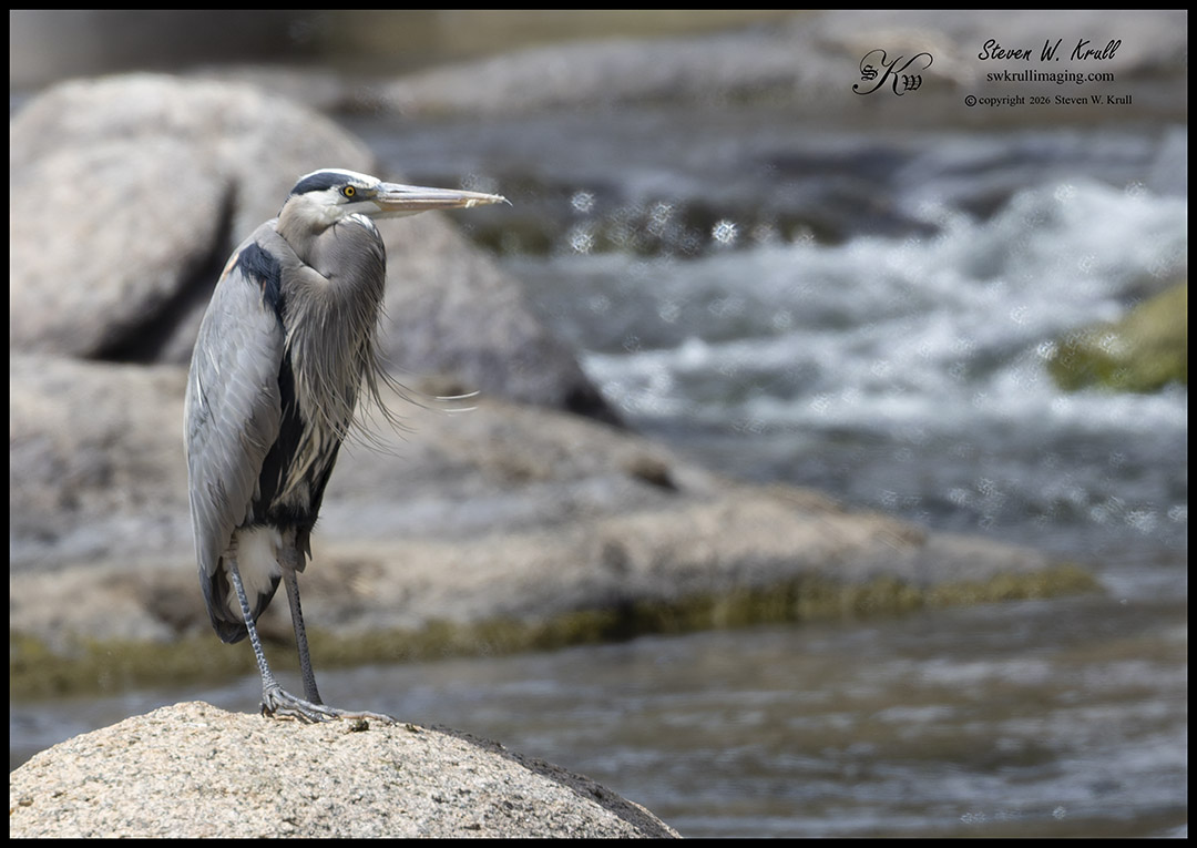 However, I was eager to drive upstream to see if I could find our osprey pair so I left the eagles to their feeding for the time. I didn’t find our osprey today, but a lone great blue heron was standing guard over the pristine blue waters of the South Platte River. This handsome fellow standing on a rock out in the middle of the river didn’t seem to mind a distant photographer with a telephoto lens.