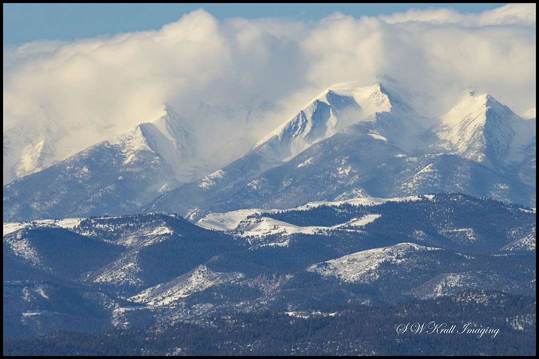 My project for the day was a visit to the Colorado Sangre de Cristo Mountain Range to shoot a panoramic image of the magnificent block fault range with a winter storm and a fog bank rolling in. It took me two days to capture all the images for this post, including the fog bank and deer herd on the second day.